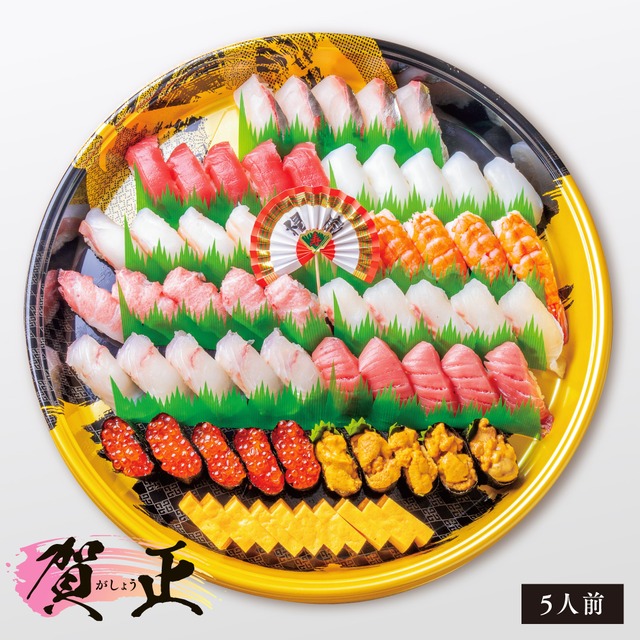 ご注文締め切り/12月29日(日) 年末年始 3日間限定! お寿司お持ち帰り 賀正 《5人前》55貫 本マグロ大トロ・本マグロ中トロ・本マグロ赤身・牛深産真鯛・牛深産クエ・牛深産シマアジ・牛深産アオリイカ・天草産ヒラメ・天草産生ウニ・イクラ・茹でエビ・飾り玉子 ※年末年始の特別メニューは、すべてわさび抜きでご提供させていただきます。 ※店頭お渡し商品です。システムの関係上ご注文画面で、お届け先ご住所等の入力が必須となってておりますが、ご自宅への発送は行っておりませんのでご了承ください。 ※掲載の写真はイメージです。 ※特別メニューのため、寿司の入れ替はできかねます。
