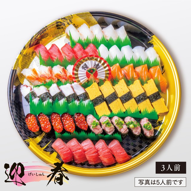 ご注文締め切り/12月29日(日) 年末年始 3日間限定! お寿司お持ち帰り 迎春 《3人前》30貫 本マグロ中トロ・本マグロ赤身・牛深産真鯛・牛深産アオリイカ・牛深産タコ・サーモン・赤エビ・イクラ・ネギトロ・玉子 ※年末年始の特別メニューは、すべてわさび抜きでご提供させていただきます。 ※店頭お渡し商品です。システムの関係上ご注文画面で、お届け先ご住所等の入力が必須となってておりますが、ご自宅への発送は行っておりませんのでご了承ください。 ※掲載の写真はイメージです。 ※特別メニューのため、寿司の入れ替はできかねます。